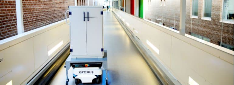 På Odense Universitetshospital frigør en transportrobot 2,5 timer om dagen, som de ansatte kan bruge på andre opgaver end intern transport. Den transporterer blodprøver fra et ambulatorie i stueetagen og ned til analyselokalerne i kælderetagen. Robotten åbner selv døre, tager elevatoren og færdes sikkert rundt blandt patienter og ansatte.